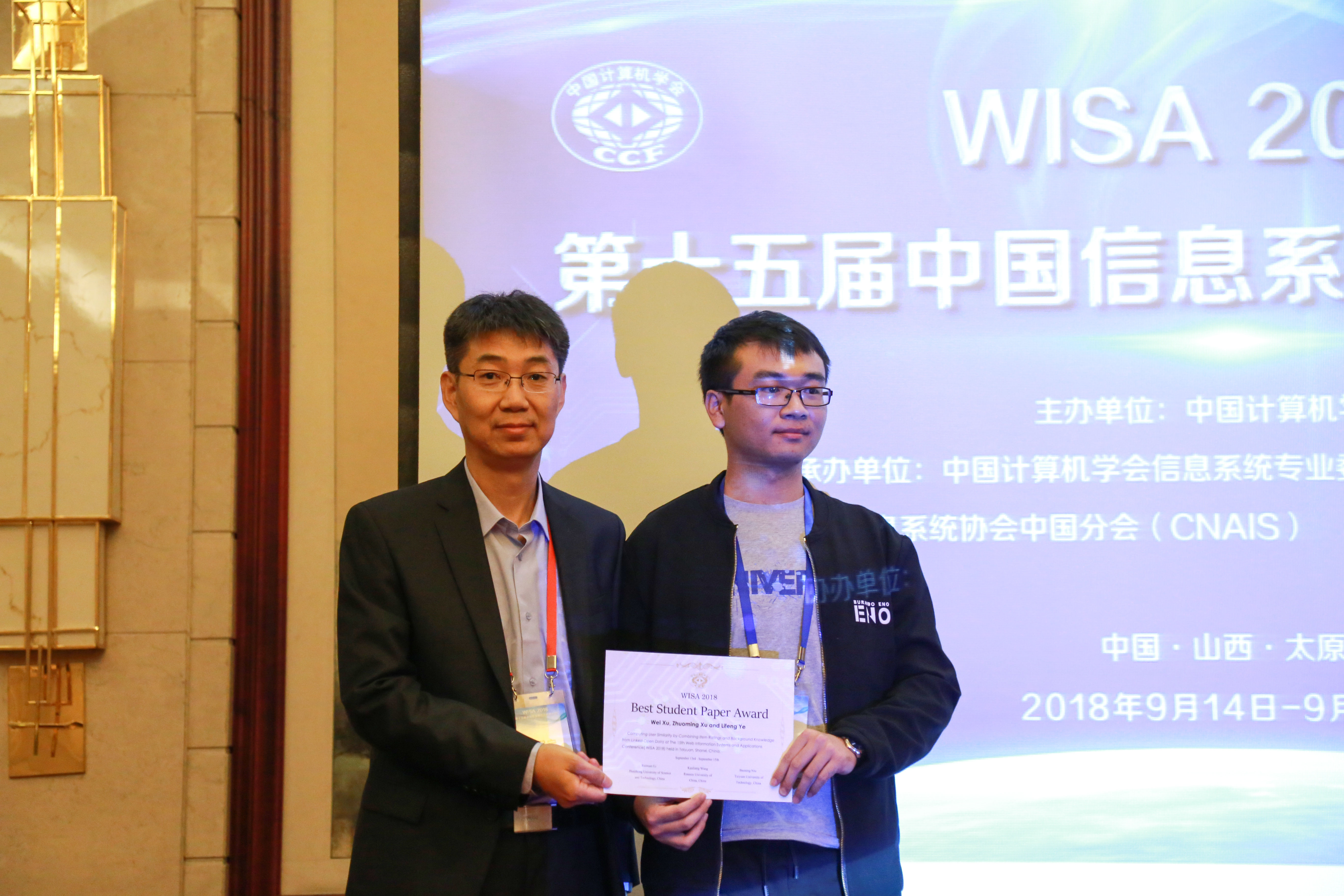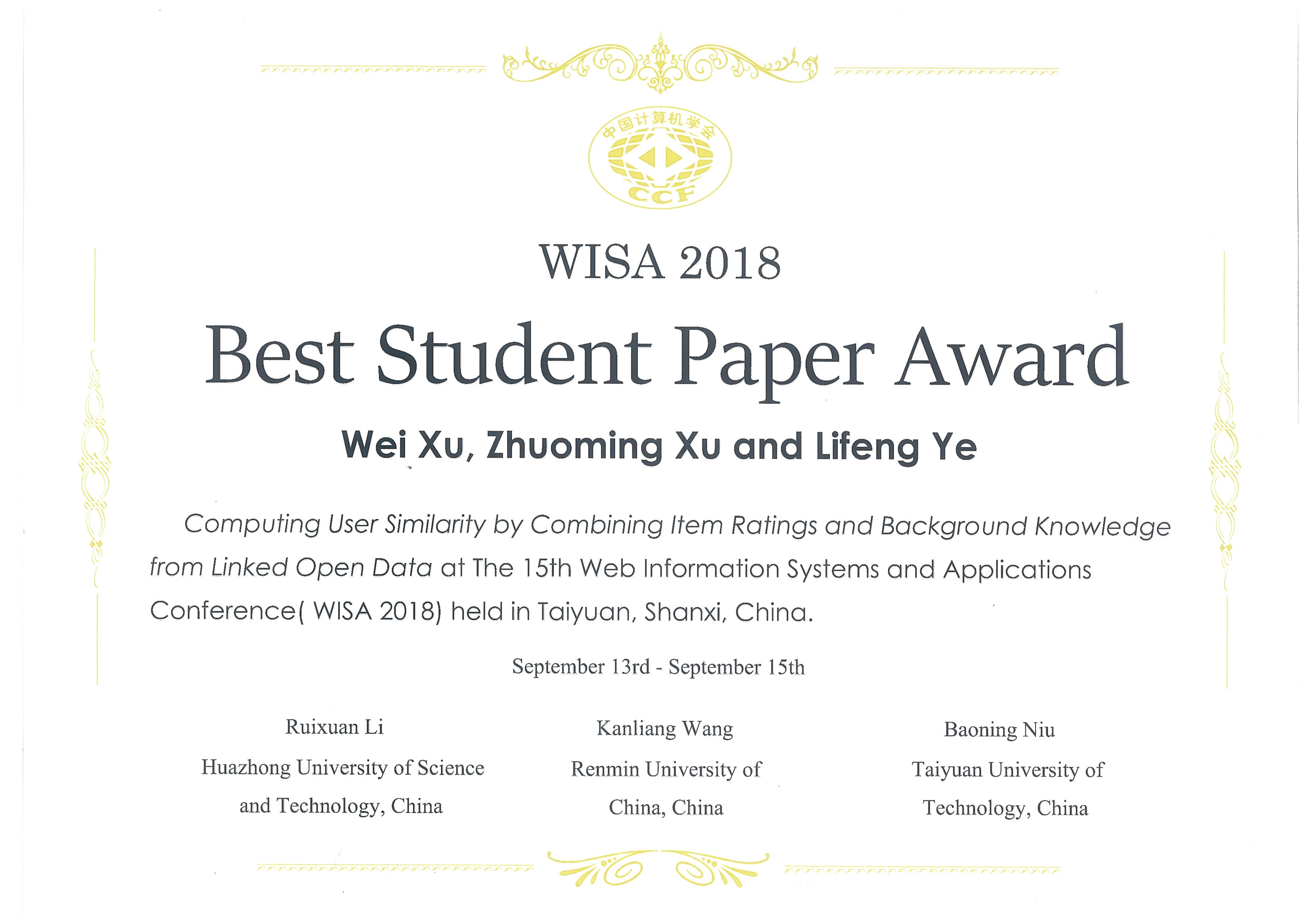 由中国计算机学会(CCF)主办、CCF信息系统专业委员会和太原理工大学承办的第十五届中国信息系统及应用大会(英文会议名称:The 15th Web Information Systems and Applications Conference, WISA 2018)于2018年9月13-15日在山西太原成功举行。我院许卓明教授和他指导的2016级硕士研究生许伟同学出席了该学术会议,许伟同学在会上认真报告了被会议录用的英文论文:Wei Xu, Zhuoming Xu, and Lifeng Ye: Computing User Similarity by Combining Item Ratings and Background Knowledge from Linked Open Data。该英文论文荣获会议的最佳学生论文奖(Best Student Paper Award)。