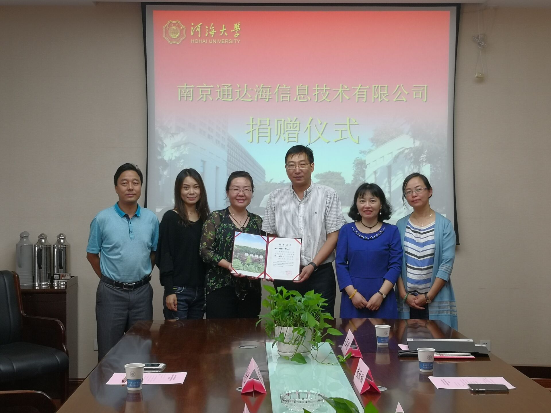 9月29日,南京通达海信息技术有限公司向河海大学捐赠10万元,用于计算机与信息学院学科建设与发展。捐赠仪式在我校计算机与信息学院举行。河海大学合作办、校友办、基金办主任黄林楠与南京通达海信息技术有限公司行政总监徐东惠出席捐赠仪式并签订捐赠协议。计算机与信息学院院长叶保留、党委书记张雪刚、副书记张炜、南京通达海信息技术有限公司人力资源部经理李睿及学校和学院的相关人员参加了会议。