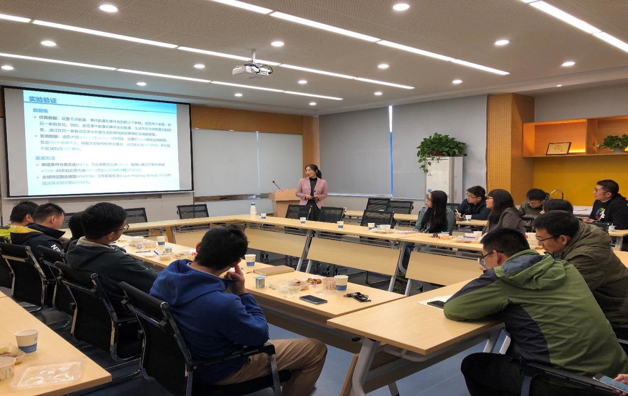 毛莺池教授做了题为“Event Fusion and Decision Based on Node Reliability in Wireless Sensor Networks”的学术报告。重点介绍了传感网络部署在大型土木结构工程中监测结构体中不同物理量变化的情况,并针对结构工程运行工况决策准确性和实时性,提出基于区域划分的传感器网络决策框架(SNDF),分两阶段进行安全评判。在场的各位老师和同学针对相关内容,对在局部区域事件分类阶段和全局事件决策融合阶段所采用的不同方法进行了热烈的讨论与分析,活动取得圆满成功。