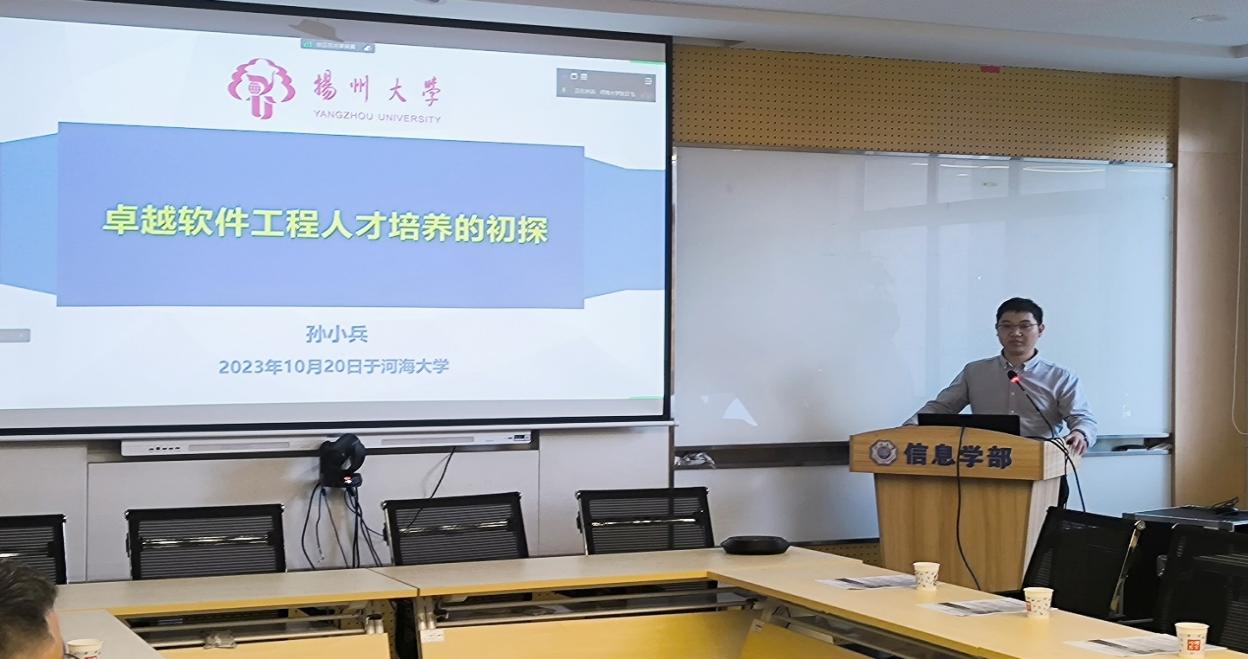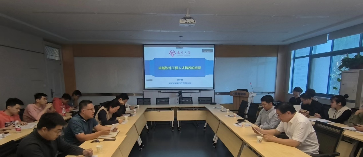 本次示范教研活动由主题报告和交流讨论两个环节组成。首先由扬州大学信息工程学院(人工智能学院)院长孙小兵教授带来的“卓越软件工程人才培养初探”主题讲座。孙小兵教授分析了2022年底江苏省结合省高等教育改革发展实际出台的《卓越工程师教育培养计划2.0的实施意见》(苏教高〔2022〕10号),介绍了扬州大学软件工程专业作为国家一流专业建设点,在探索适合地方卓越软件工程人才培养的方式过程中所具有的特色及优势,讨论了平台与师资的合作方式、人才培养改革思路与举措。最后孙老师结合若干案例,分享了扬州大学卓越软件工程人才培养过程中的建设成效,并阐明了下一步的建设目标与规划。