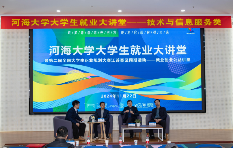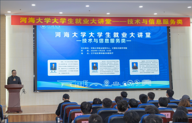 为积极搭建学校与企业、学生与职场之间高效沟通的桥梁,切实推动就业教育与思政教育、专业教育深度融合,不断提升就业育人实效,2024年11月22日下午,由学校学生就业指导中心和计算机与软件学院主办的河海大学大学生就业大讲堂(技术与信息服务类)暨第二届全国大学生职业规划大赛江苏赛区同期活动——就业创业指导公益巡讲在江宁校区举行。活动邀请江苏电信智能云网调度运营中心人力资源经理程炜、南京华曼软件技术有限公司创始人沈宗军、南京通达海科技股份有限公司副总经理施健伟等三位嘉宾出席,河海大学计算机院党委副书记张剑宇主持活动。计算机与软件学院、商学院、公共管理学院、数学学院等200余名本科生、研究生同学参加。