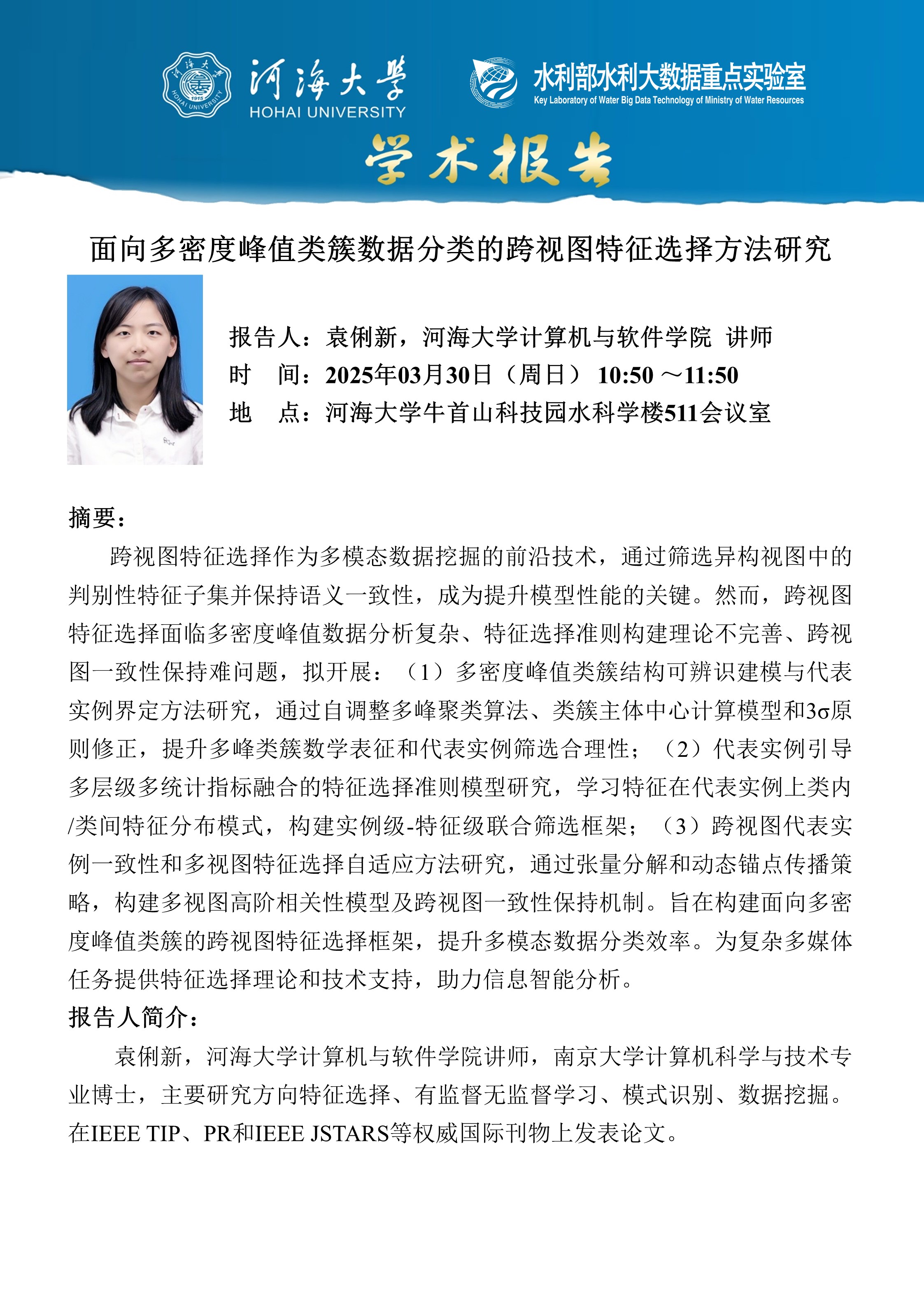 学术报告:面向多密度峰值类簇数据分类的跨视图特征选择方法研究