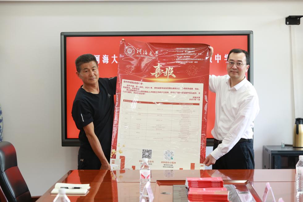 在座谈会上,双方还分别围绕徐州市第一中学、侯集高级中学学子在河海大学的成长发展情况,河海大学在江苏省的招生政策等进行了深入交流。会上,陈达代表河海大学向两所中学赠送喜报,展现了我校与高中紧密合作、协同育人成果。