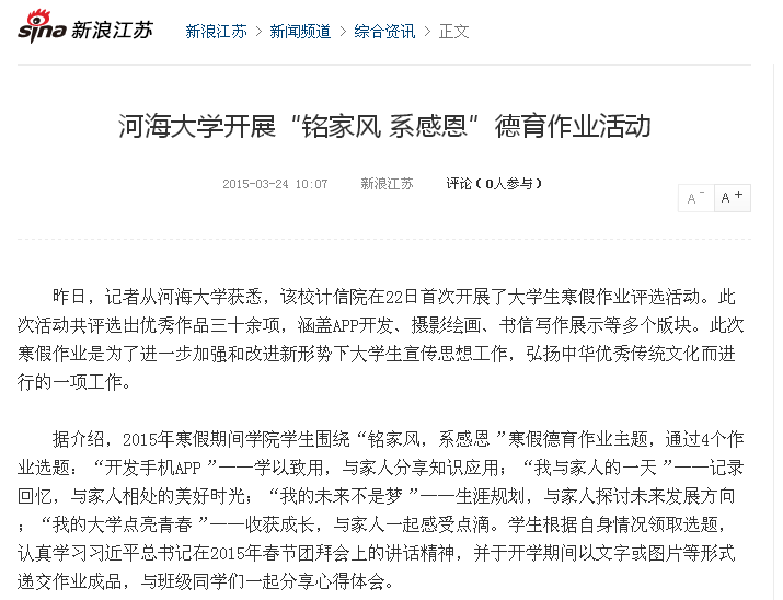 我院弘扬中华优秀传统文化,创新大学生思想政治教育工作得到新浪江苏报道