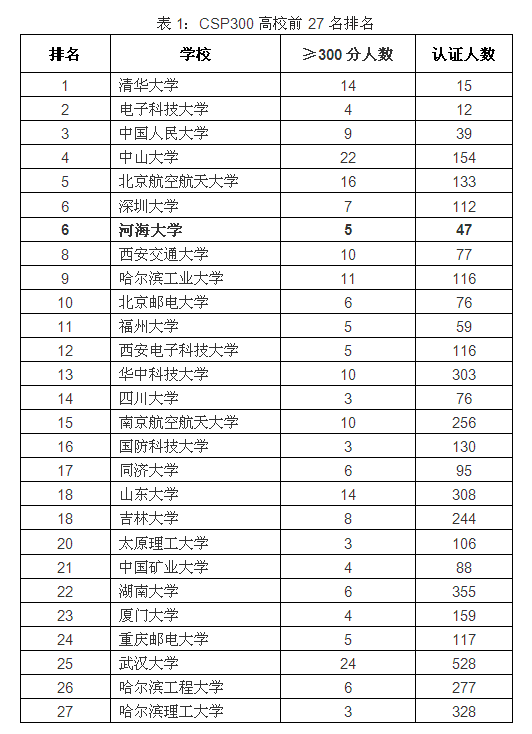 此次认证考试共有来自全国200多高校的6931人参加,满分500分。认证成绩400分以上的有44人,我校1人。认证成绩在300分以上且参加认证人数在10人以上的有39所院校,共238人。看片狂人 排名第6,各校300分以上人数排名(CSP300)(见表1)。