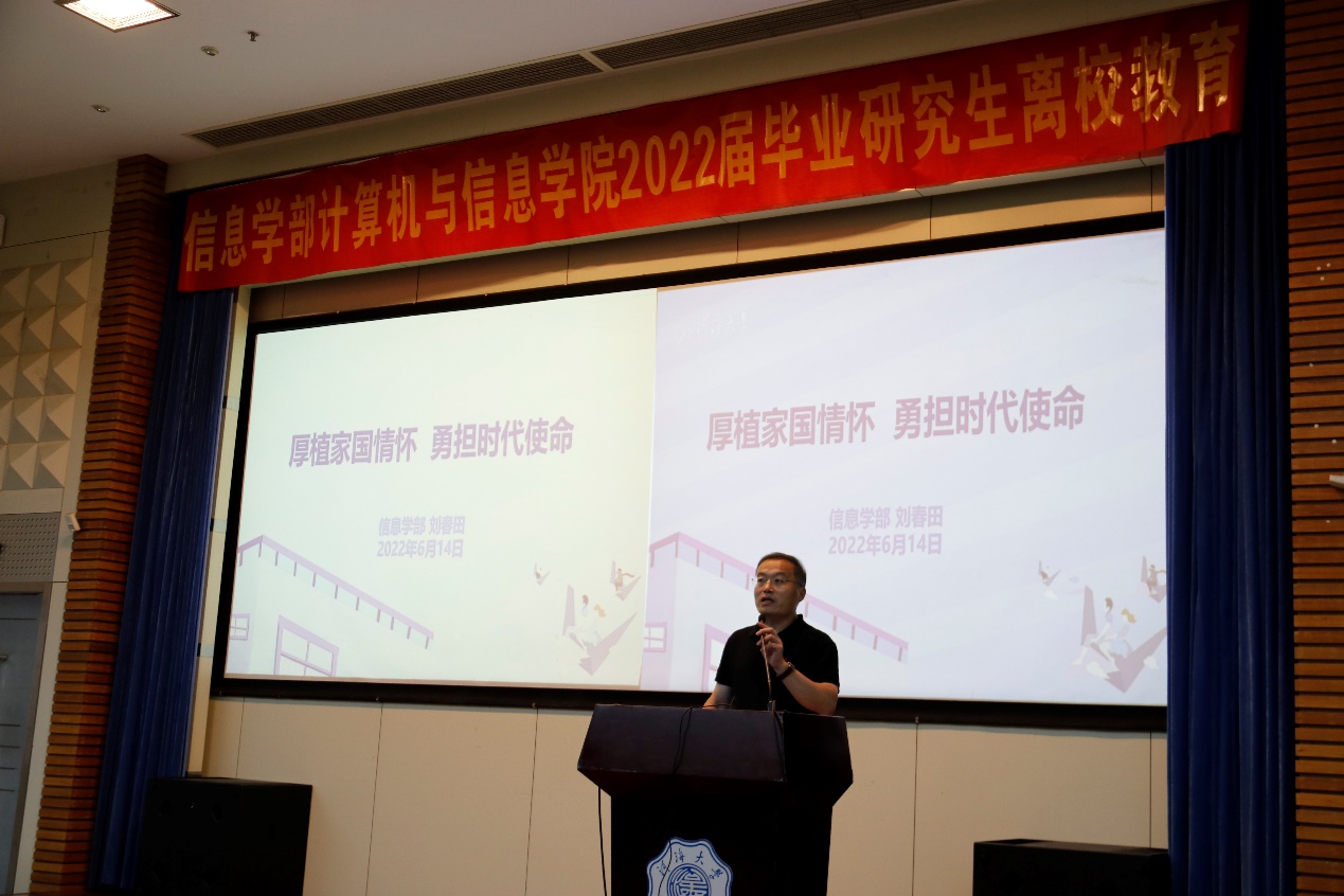 信息学部党委副书记刘春田以“厚植家国情怀,勇担时代使命”为主题,向全体毕业生们做分享交流。他向毕业研究生们在校期间取得的优异成绩表示祝贺,寄语大家走出校园之后,在各自的岗位上继续施展才智,服务社会,报效祖国。刘春田副书记还对毕业研究生提出了三点希望:一是要有家国情怀,立大志,明大德,做社会主义核心价值观的坚定信仰者、积极传播者、模范践行者;二是要终身学习,学习专业业务能力,学习重要讲话精神,在学习的道路上永不懈怠;三是要肩负起社会责任,让青春在为祖国、为人民、为民族、为人类的奉献中焕发光彩。