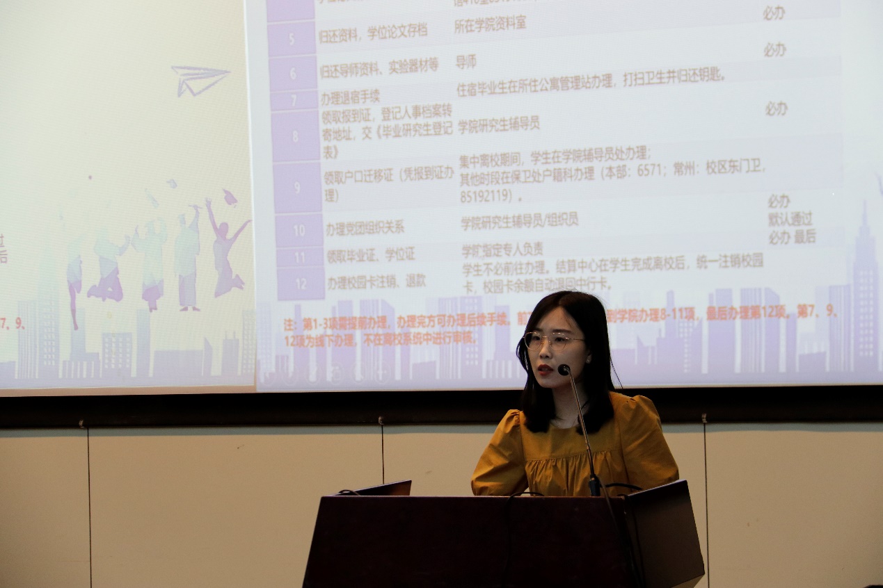 研究生辅导员解晓敏向全体毕业研究生讲解了毕业离校手续的办理流程,同时对毕业研究生深情寄语:愿前程似锦,一路繁花相送;愿历尽千帆,归来仍是少年。