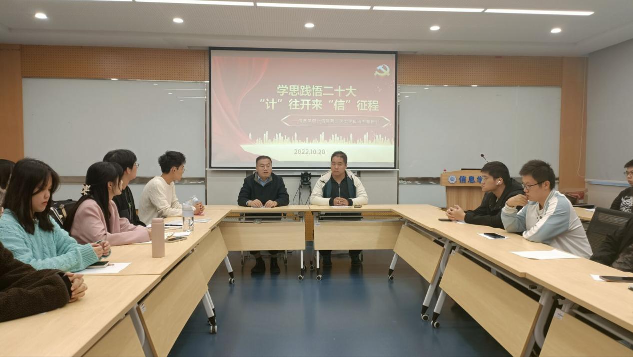 同心向党盼盛会,携手奋进启新程。为庆祝党的二十大胜利召开,教育引导学生坚定理想信念,学习宣传党的二十大精神,10月20日下午,信息学部计信院组织计算机专业(二学位)开展了“学思践悟二十大,‘计’往开来‘信’征程”主题班会活动。信息学部党委副书记刘春田,辅导员杨成伟,计算机(二学位)全体成员参加,班会由辅导员杨成伟主持。