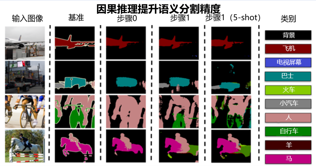 针对上述挑战,本文提出了一种基于因果推理的框架,通过系统性解耦语义偏移与不完整性的因果关系提升模型性能。该方法包含两大创新模块:因果干预模块(CIM)采用前门调整技术阻断背景变量对旧类别的干扰,通过原型注意力机制动态更新旧类别原型权重,生成无偏预测结果;原型细化模块(PRM)利用元学习从旧类别中提取跨类别依赖知识,指导新类别原型的语义补全,并结合情景学习模拟多阶段增量过程以增强模型适应性。实验表明,该方法在PASCAL-VOC 2012和ADE20k数据集上显著优于现有技术,新类别的5-shot/1-shot mIoU分别提升6.3%和3.8%,旧类别抗遗忘能力提升12.5%,验证了所提方法的有效性。